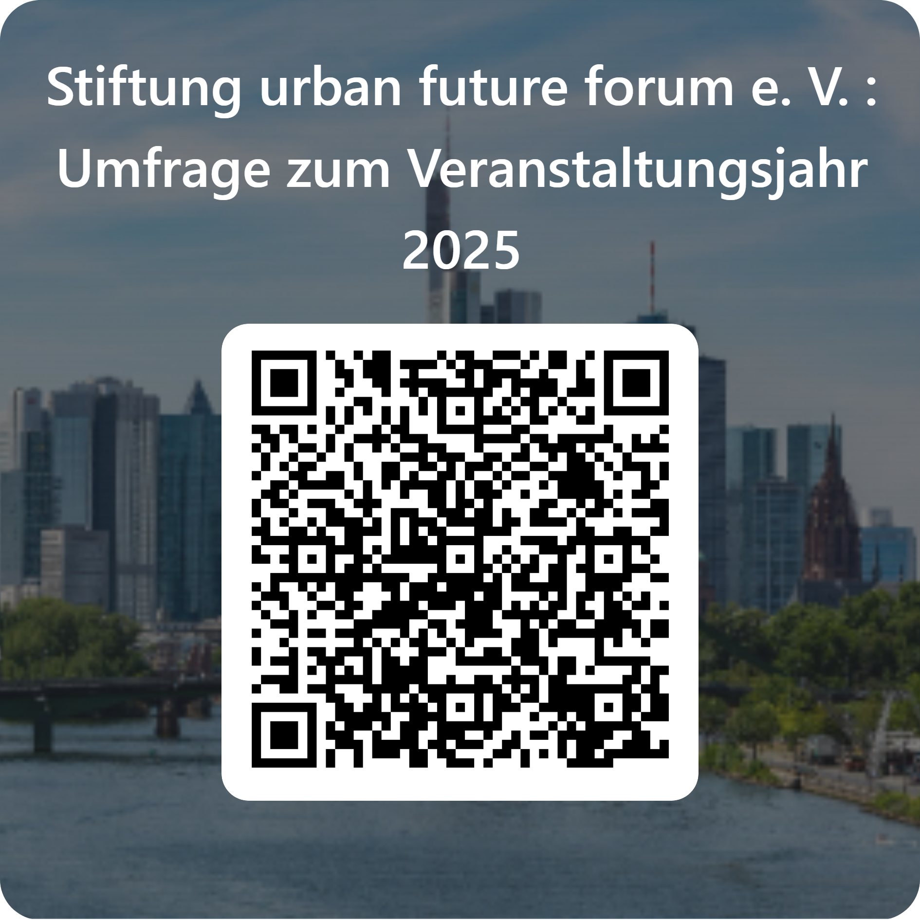 unser Veranstaltungsjahr 2025 haben wir erfolgreich beendet, weshalb wir uns bei allen Teilnehmerinnen und Teilnehmern, Gästen sowie unseren Unterstützerinnen und Unterstützern herzlich bedanken möchten. Wir würden uns über Ihr Feedback zu unserem Veranstaltungsjahr 2025 freuen, unter folgendem Link oder dem nebenstehenden QR-Code: Stiftung urban future forum e. V. : Umfrage zum Veranstaltungsjahr 2025 Wir werden Sie hier rechtzeitig über unsere folgenden Veranstaltungen im Jahr 2026 informieren. Wenn Sie an den exklusiven Veranstaltungen teilnehmen möchten, freuen wir uns über eine Mitgliedschaft Ihrerseits. Alle Informationen sowie die Mitgliedsanträge finden Sie hier: Mitgliedschaft. Um Sie über unsere aktuellen Veranstaltungen auf dem Laufenden zu halten, bieten wir Ihnen einen Newsletter an. Wenn Sie diesen Newsletter erhalten möchten, senden Sie uns bitte eine kurze E-Mail an mail@urbanfutureforum.org. Wenn Sie mehr über uns erfahren möchten, empfehlen wir Ihnen, einen Blick auf unsere Grundsätze und Ziele zu werfen. Mit freundlichen GrüßenUniv. Prof. Helmut Kleine-Kraneburg, Vorstandssprecher, mit Team.