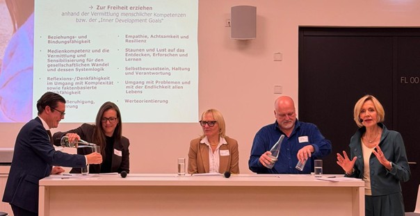 Nach dem tiefgründigen Vortrag von Prof. Dievernich leitete unser Vorstandsmitglied Petra Gerster in die anschließende Podiumsdiskussion über. Neben Frau Gerster als Moderatorin und Herrn Dievernich als Diskutant nahmen noch Susanne Albert, die Schulleiterin der Bergiusschule, Ute Kandetzki, die Geschäftsführerin der Goethe-Lehrkräfteakademie, und Prof. Holger Horz, der Direktor der Akademie für Bildungsforschung, an der Diskussion teil.